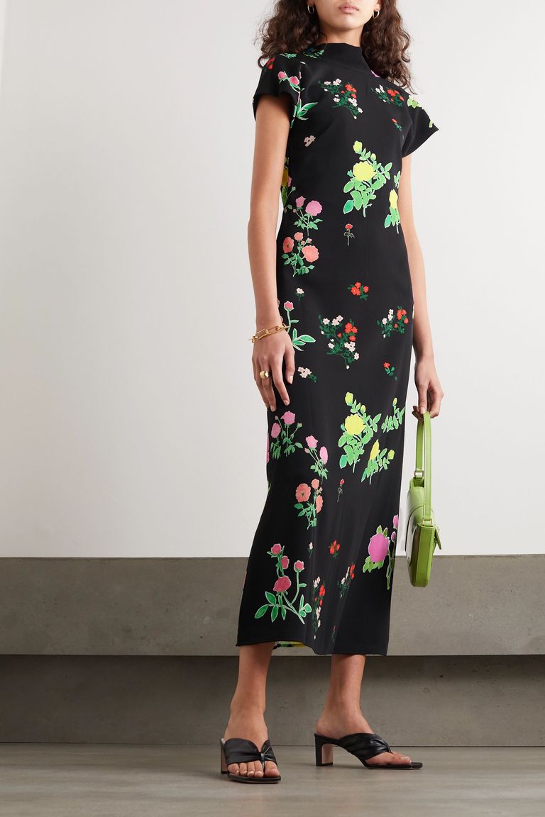 من أحد الفساتين الصيفية الرائجة هو فستان فلوري طويل من قماش الكريب ونقشات الزهور ذو الألوان المبهجة.