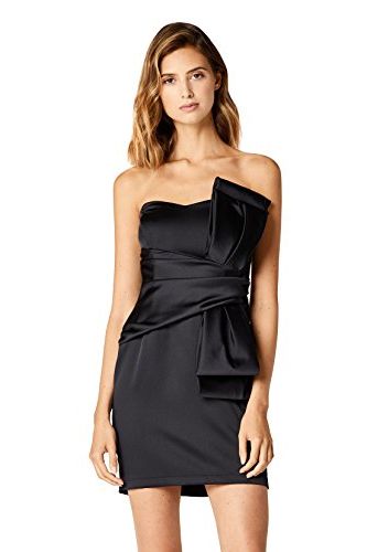 يمكنكِ إرتداء فستان من الساتان اللامع المطرز بالترتر متوسط الطول بفتحة ساق أمامية وصندل اسود سيور كعب عالِ.