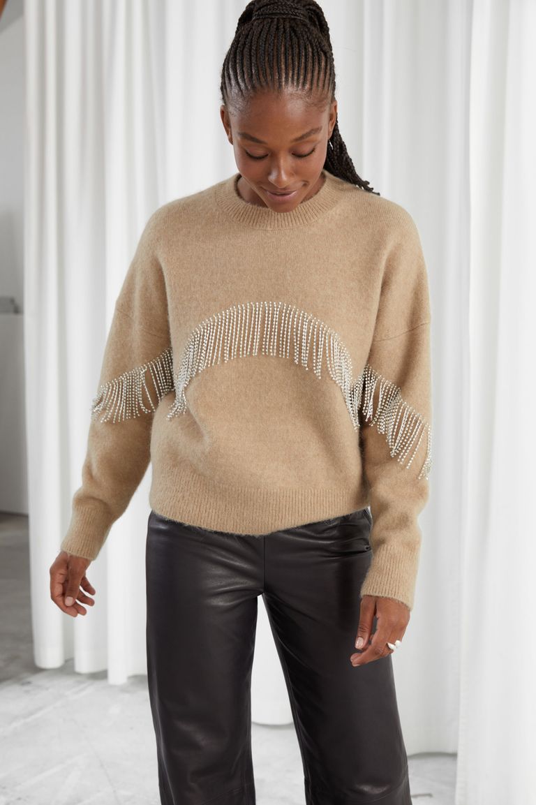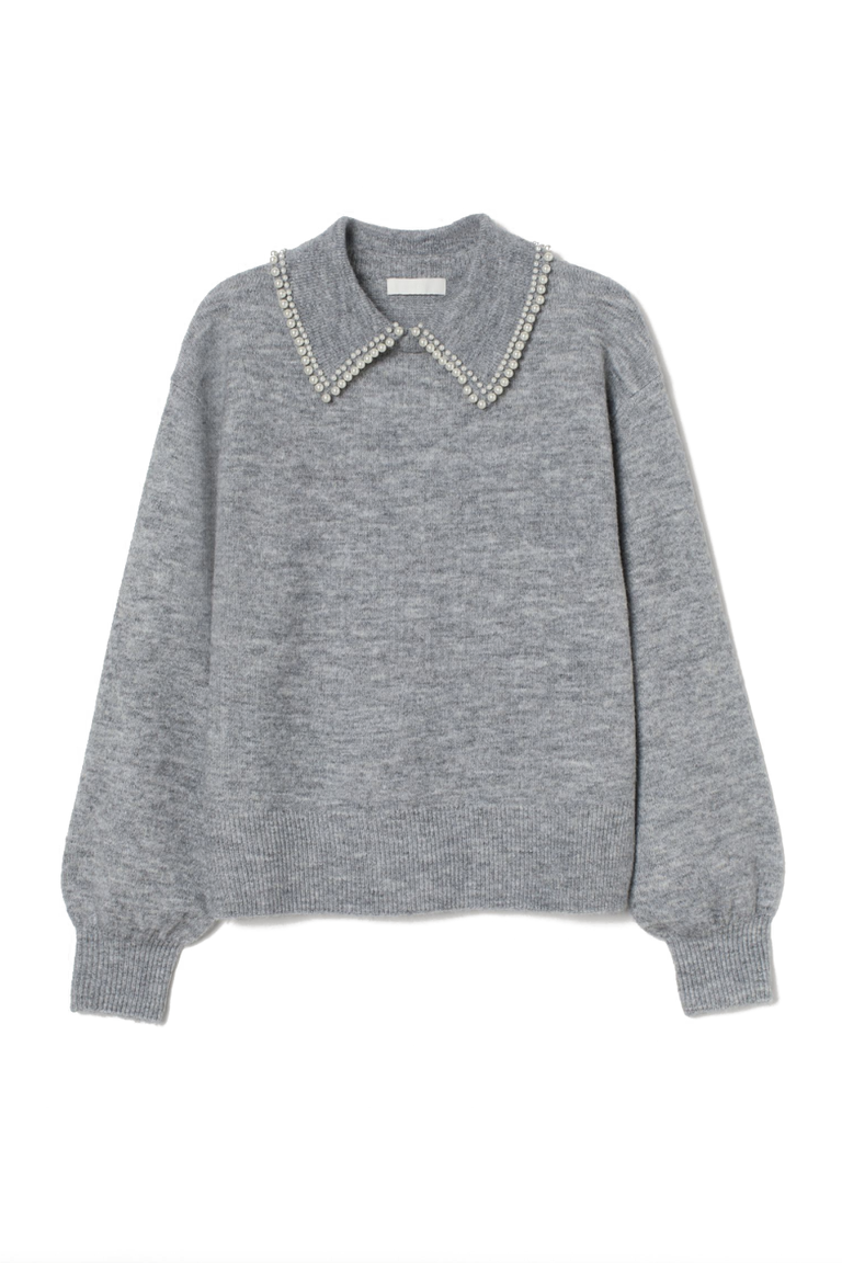 من الكنزات الصوفية المميزة هي المطرزة باللؤلؤ عند منطقة الياقة فاللؤلؤ يضيف إطلالة جميلة وأنيقة ويمكنكِ تنسيقها مع سروال من الجينز الأبيض او تنورة جلدية وإذا كنتِ محجبة فطرحة شيفون باللون الأوف وايت أو الأبيض ستكون مناسبة.