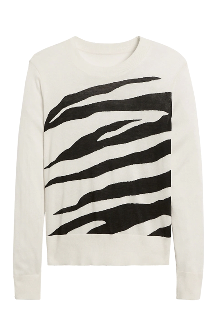 من القطع الرائجة هي الكنزات الصوفية بصيحة الزيبرا بلونيها الأبيض والأسود ويمكنكِ تنسيقها مع سروال اسود ومعطف اسود وحجاب باللون الأبيض أو الأرجواني.