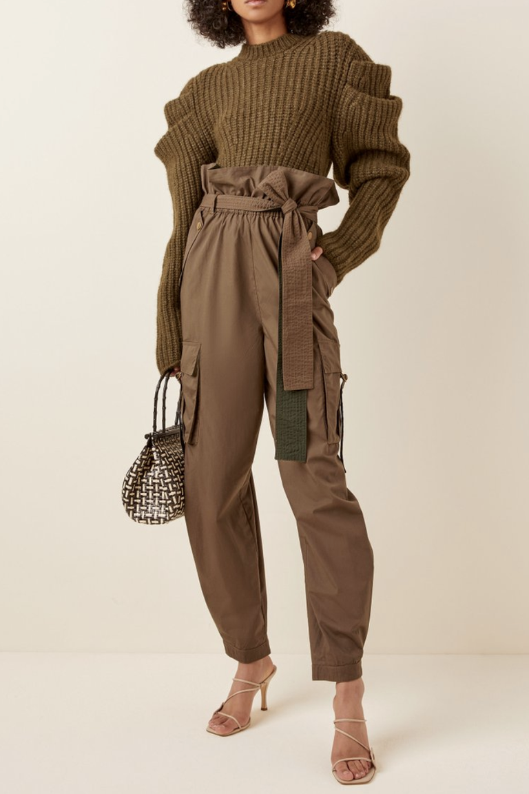 من الكنزات الرائجة هي المضلعة المصنوعة من جلد حيوان الألبكة والتي تمتاز بأكمامها الضخمة ومن الممكن ان ترتدي نفس الإطلالة الموجودة في الصورة مع حجاب باللون الأوف وايت أو البيج الفاتح.