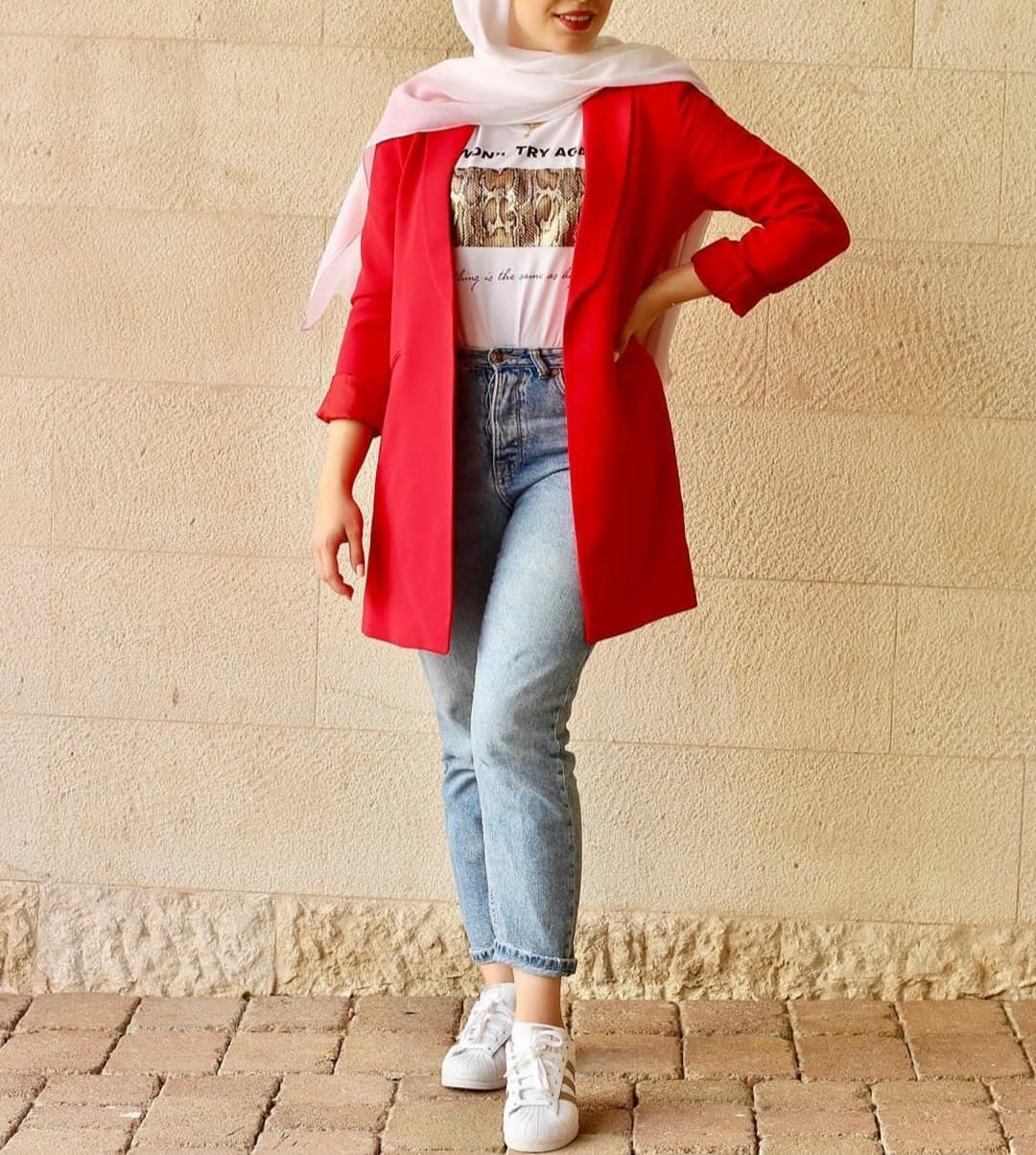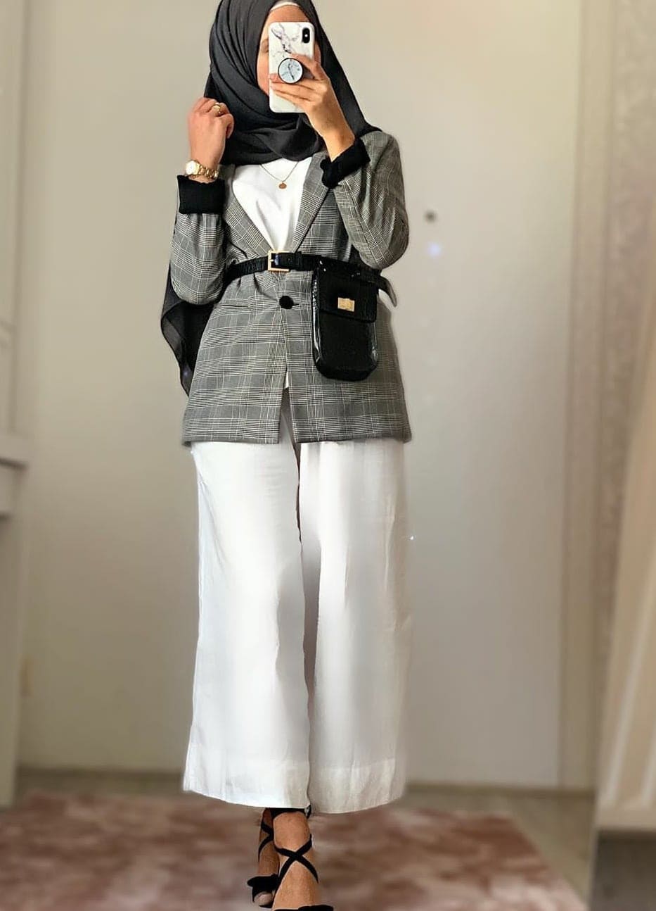 من الالون الجرية والمفضلة لدى الجميع، فقد نسقت العارضة البليزر مع بنطلون جينز أزرق وتيشرت أبيض مطبوع وحذاء رياضي أبيض وحجاب باللون الأبيض، هى الإطلالة كاجوال بإمتياز يمكنك إعتمادها في خروجات الأصدقاء والجولات الترفيهية.