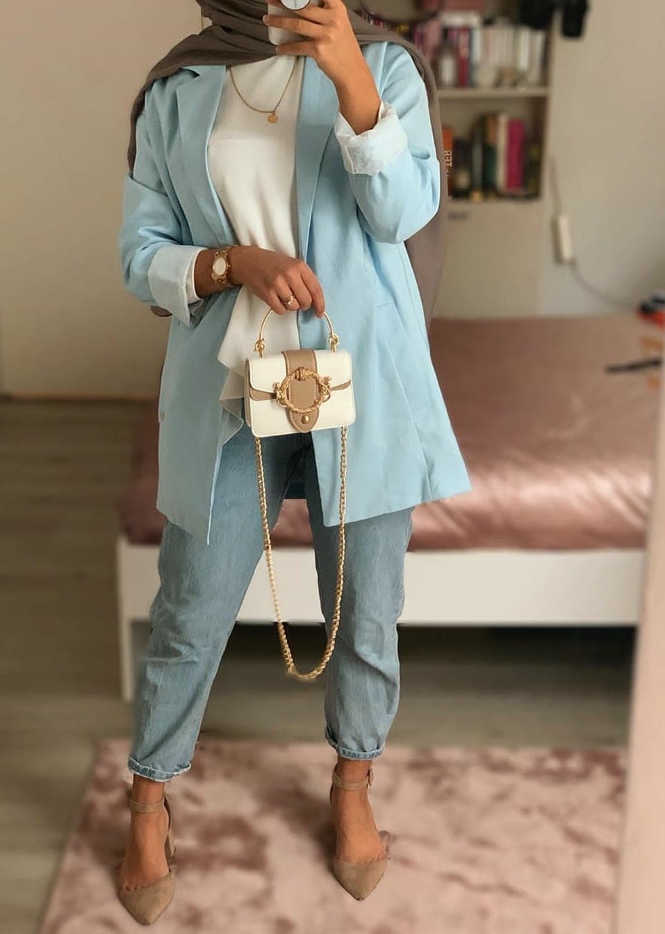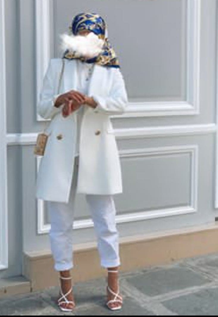 تم تنسيق البليزر الأبيض الطويل بطريقة بسيطة وأنيقة، فقد نسقته العارضة بارتداء بنطلون جينز أبيض "مم فيت" وبلوزة بيضاء وأختارت حجاب مزهرى مزقرش، وزينت الإطلالة بحذاء مكشوغ باللون الأبيض وحقيبة باللون الذهبي.