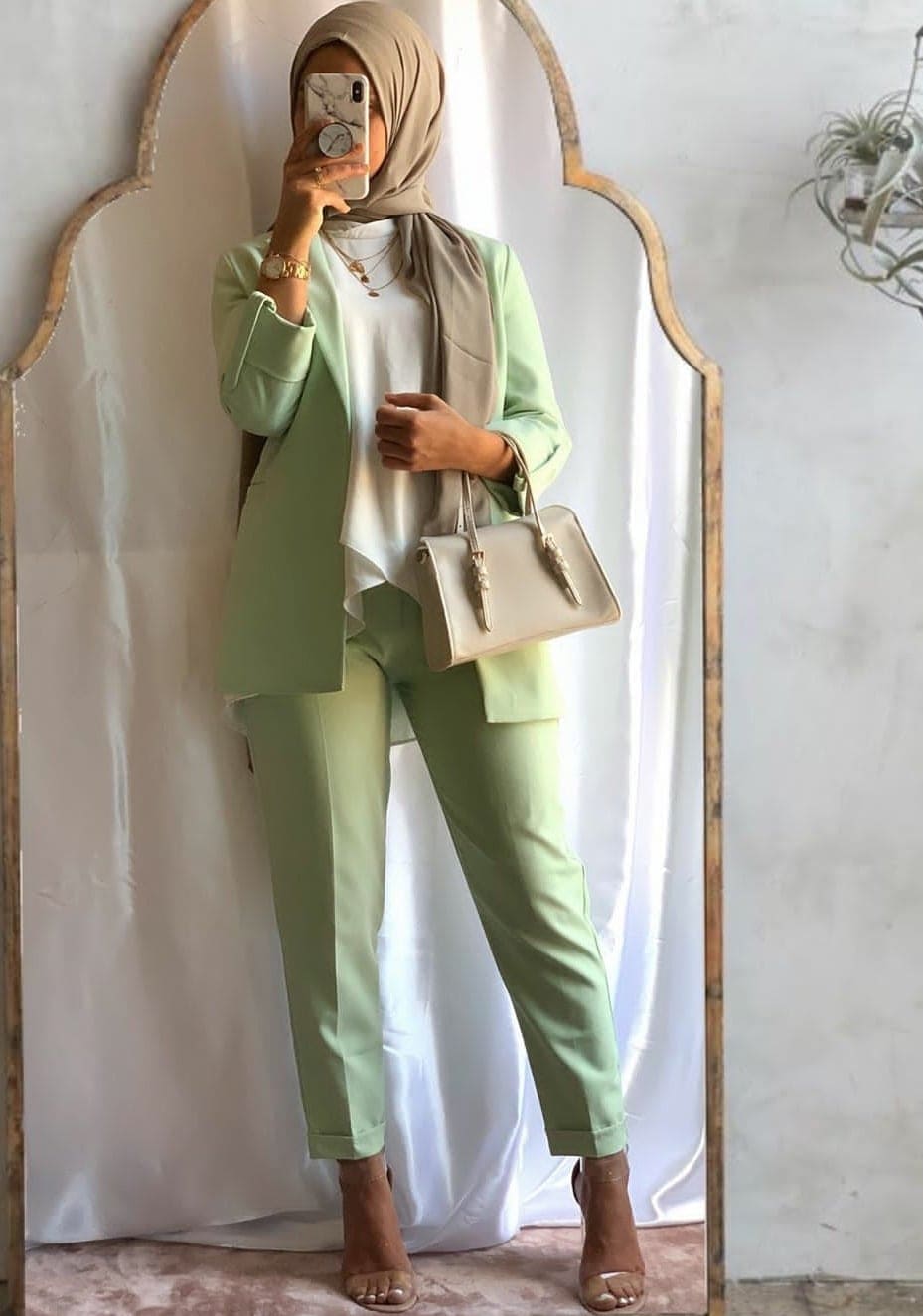 اختارت العارضة أن ترتدى بليزر وبنطال باللون المنت جرين وتوب أبيض أنيق ونسقت حجاب باللون البيج وزينت الإطلالة بحذا مكشوف باللون البيج وحقيبة أيضاُ باللون البيج.