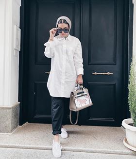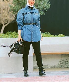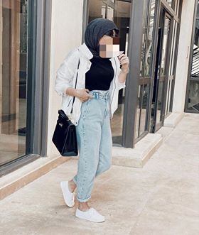 اعتمدت العارضة هنا على قميص من الجينيز باللون الأزرق ونسقت معه بنطال باللون الأسود، وحذاء وحقيبة باللون الأسود، وزرينت الإطلالة بحجاب باللون الأبيض، إطلالة بسيطة وعفوية يمكن اعتمادها في كافة الأوقات، وتصلح بشكل كبير لمرتدى الجامعات، نظراً لسهولتها وعدم تكلفتها.