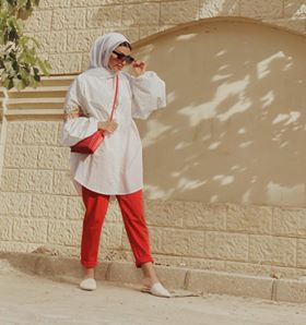 اعتمدت العارضة على إطلالة صيفية بامتياز، فقد نسقت قميص أبيض طويل بأكمام منتفخة، وبنطال باللون الأحمر الجرئ وحقيبة نفس اللون حذاء، وزينت الإطلالة بحجاب أبيض مريح لهذا الموسم الحار، هذه الإطلالة يمكنك اعتمادها من الصباح حتى الليل، كونها بسيطة وعصرية وأنيقة.