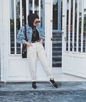 نسقت العارضة بنطال بوي فريند باللون الأزرق الفاتح، وتوب أسود وقميص أبيض، واعتمدت على حذاء رياضي أبيض، وحجاب وحقيبة باللون الأسود. يمكنك إعتماد هذه الإطلالة في خروجات نهارية برفقة الأصدقاء.