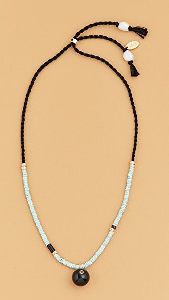 قطعة بسيطة مكونة من الخرز الأبيض والفيروزي مع وجود دلاية سوداء مستديرة مستوحاه من الأشكال المدارية والفضاء ستكون قطعتك المناسبة للخروج نهارًا بصحبة اصدقائك.