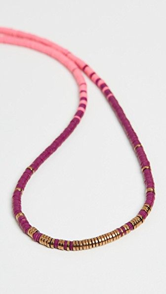 هذه القلادة التي تجمع بين لونين الفوشيا والوردي الفاتح بالإضافة لقطع باللون الذهبي يمكنك ِ أن ترتديها كما هي أو تضيفي إليها قطعة صدفة متدلية،هذه القطعة من الأكسسوارات ملائمة لأي مناسبة سواء نهارية او مسائية.