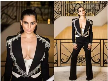 ظهرت جميلة بوليوود الشرسة ببدلة سوداء مثيرة وصدرية بيضاء، واعتمدت كانجانا مكياج نيود وعيون سموكى مثيرة.