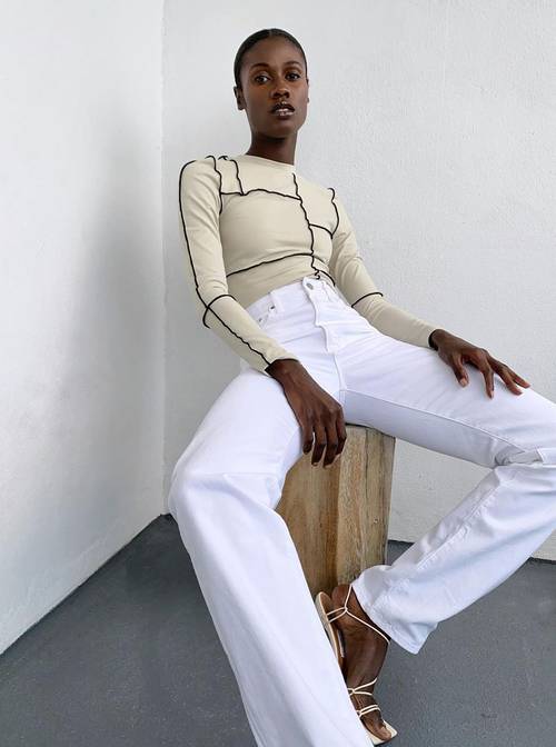 تفضل الكثير من السيدات والفتيات موضة سروال الجينز بلونه الأبيض، نسقي سروال جينز أبيض عالِ الخصر واسع الساقين مع بلوزة باللون البيج الفاتح ومحددة بخيوط سوداء وصندل من السيور باللون الأبيض.