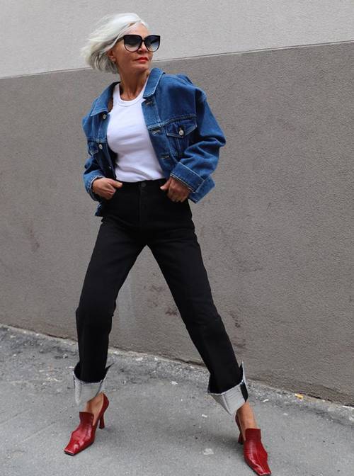 ارتدِ سروال من الجينز الأسود وتوب باللون الأبيض وسترة جينز الدينيم مع حذاء أحمر كلاسيكي.