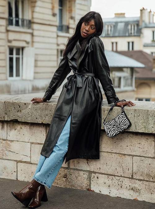 إذا كنتِ صاحبة ذوق كلاسيكي بسيط ارتدِ سروال جينز واسع الساقين مع معطف الترنش الطويل باللون الأسود وحقيبة من جلد الزيبرا وأكملي إطلالتك ب حذاء بوت كعب عالِ باللون البني اللامع.