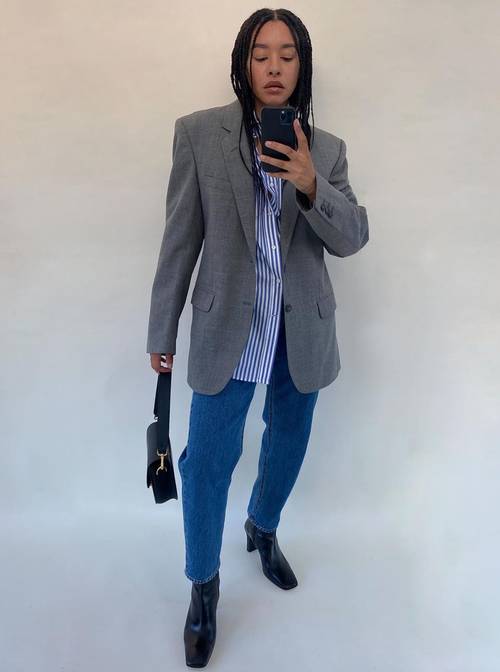 هذه الإطلالة مناسبة للعمل والخروج مع الأصدقاء، ارتدِ سروال جينز مع قميص كلاسيكي طويل مخطط باللونين الأبيض والأزرق وبليزر رمادي طويل وحذاء وحقيبة جلدية باللون الأسود.