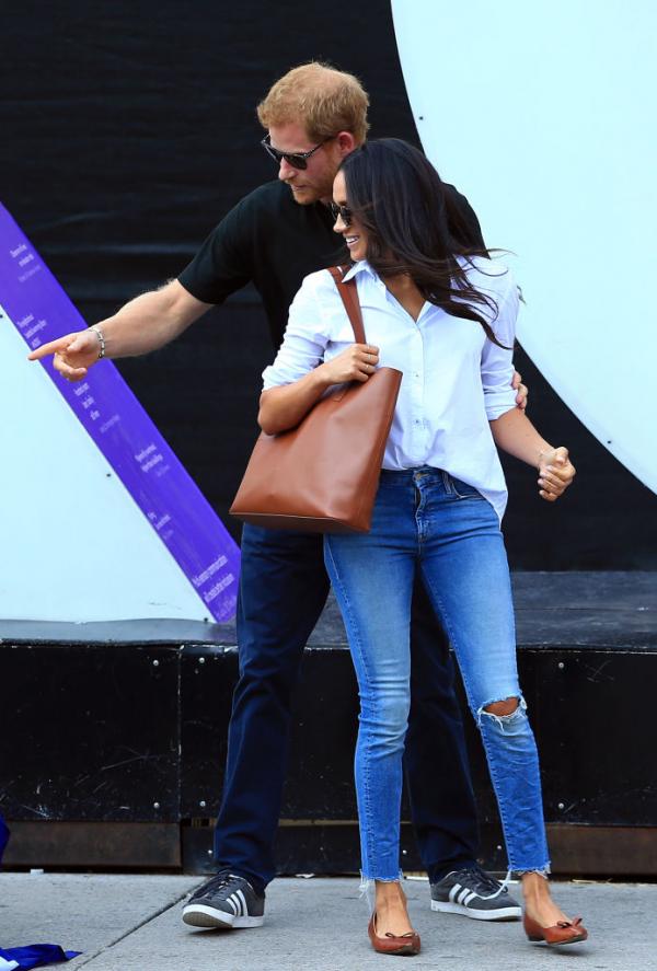 1. في أول ظهور علني لها مع الأمير هاري، ارتدت ميغان بنطلون من الجينز الأزرق مع قميص أبيض ناصع بأكمام مطوية وكان نصفه داخل بنطالها، وحملت حقيبة بنية وحذاء بدون كعب بنفس اللون.