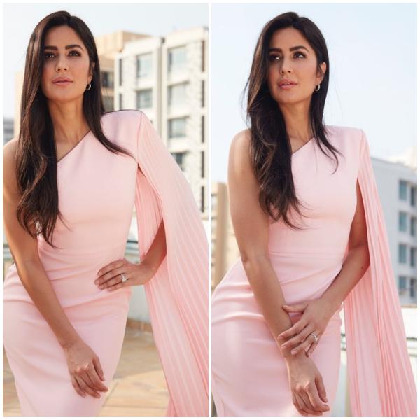 ارتدت الممثلة الهندية كاترينا كيف فستان أنثوي باللون الوردي من مجموعة أليكس بيري للأزياء وما ميز كم الكاب هو ثنياته الحديثة على جانب واحد.
