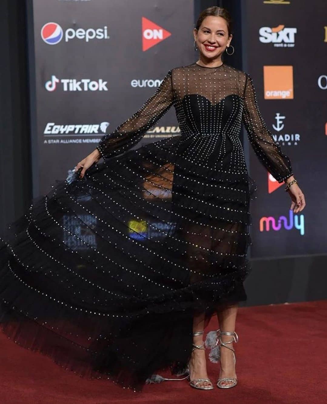 صاحبة أجمل إطلالات كما أطلق الجمهور عليها، بفستانها الأسود الكلاسيكي المخملي الأنيق الطويل والمزين بـ "ستراس" صغير عند الرقبة، كما أن الفستان مفتوح الظهر ولديه فتحة طويلة من الخلف مما جعله أكثر أناقة.