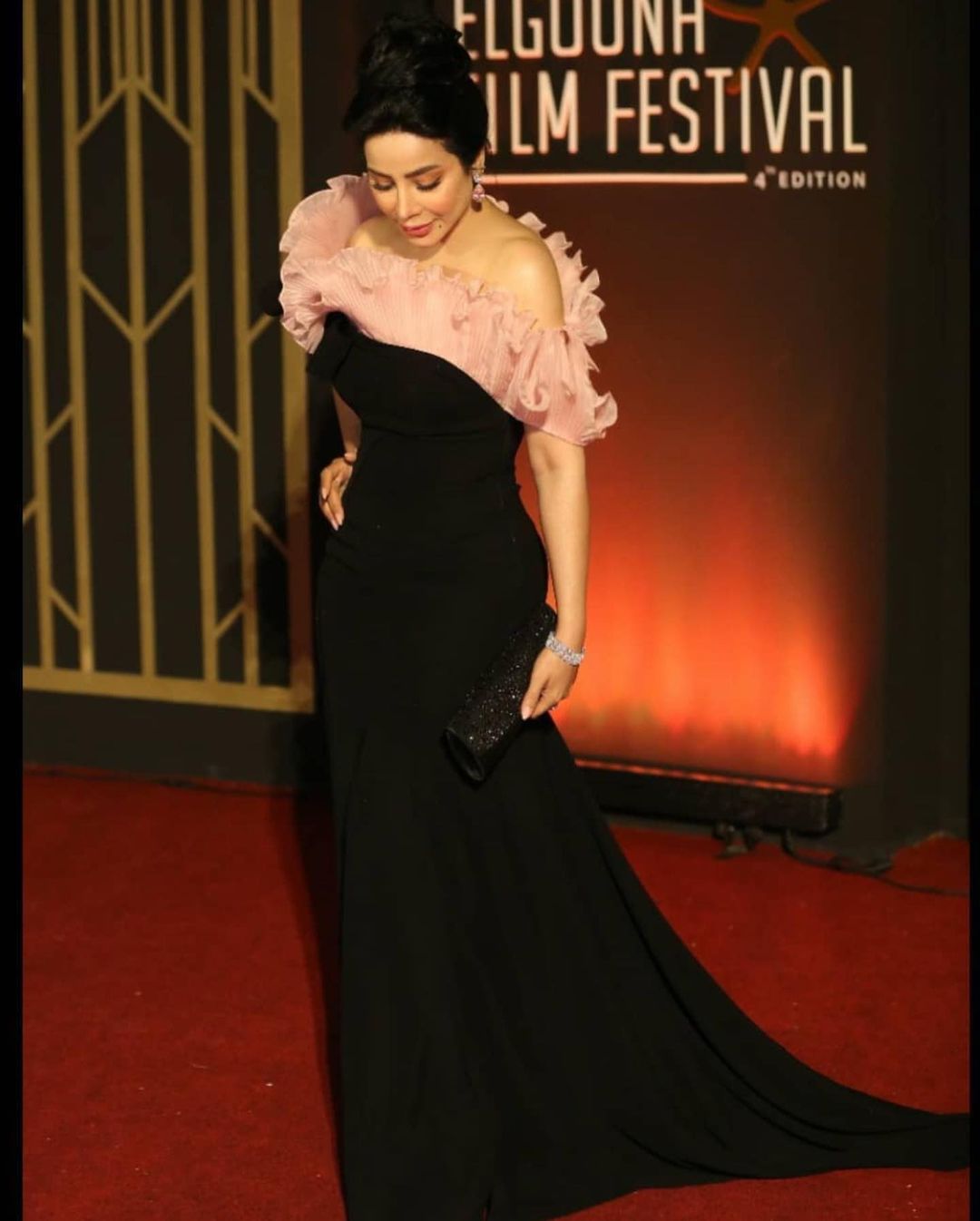 جذبت الأنظار لها من أول يوم في المهرجان بفستانها الأسود المشكوك من عند الصدر والفراشات التي تزينه من منطقة أسفل الخصر. وأكثر ما يميزه هو دمج الألوان مع الشك واللون الأسود.