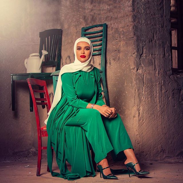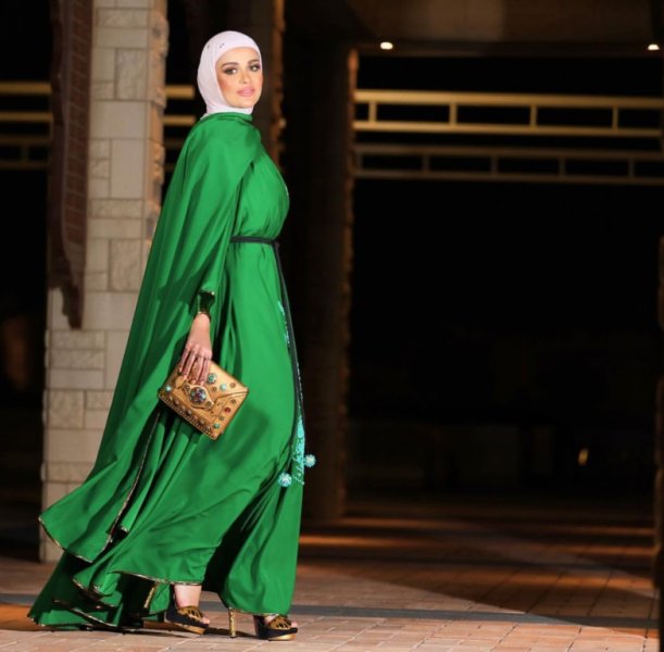 اعتمدت هنا العارضة علي قفطان باللون الأخضر الملكى ومزين بقطع الكريستالات واللؤلؤ، ونسقت معه حجاب باللون الأبيض.