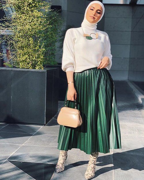 هذه الإطلالة عصرية ومناسبة للغاية للظهور صباحاً، ونسقت هنا العارضة توب أبيض مع تنورى باليسيه باللون الأخضر، وحذاء بنقشة جلد الثعبان.