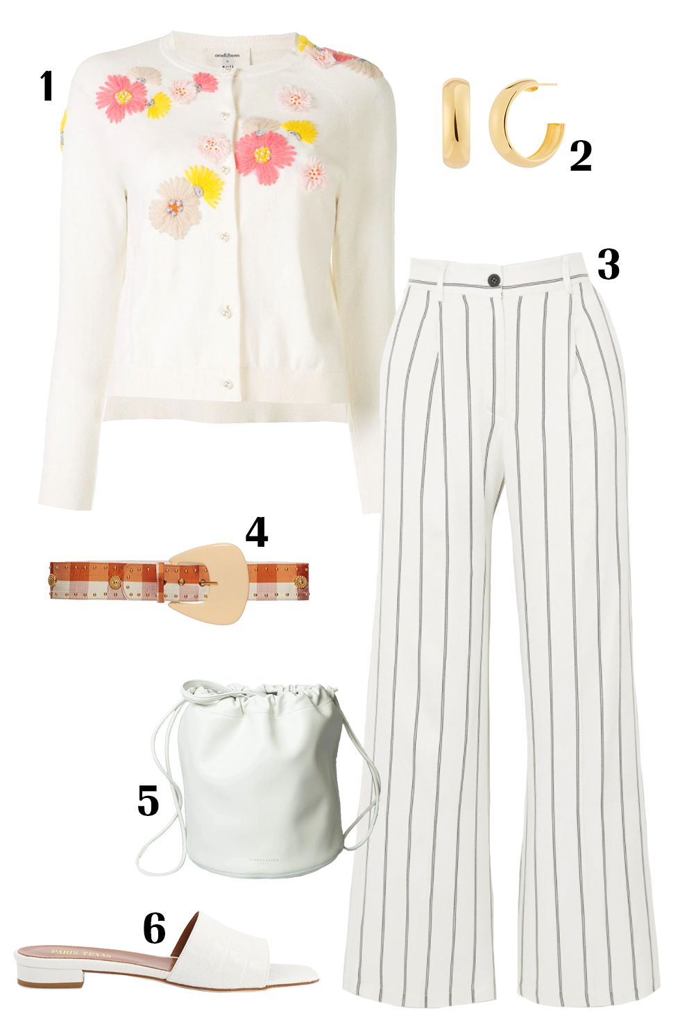 إذا كنتِ من محبي اللون الأبيض فيمكنكِ إرتداء إطلالة أحادية اللون ولكن مع بعض التعديلات مثل شيميز ابيض بنقوش زهرية ملونة مع سروال أبيض مخطط باللون الأسود لتحديد خصرك يمكنكِ إرتداء حزام عريض باللون البني واكملي الإطلالة بحقيبة يد بيضاء صغيرة و صندل مفتوح بدون كعب أو منخفض الكعب أما بالنسبة للأكسسوارات فأقراط نصف تارة ذهبية ستفي بالغرض و تظهرك بشكل أنيق وعصري.