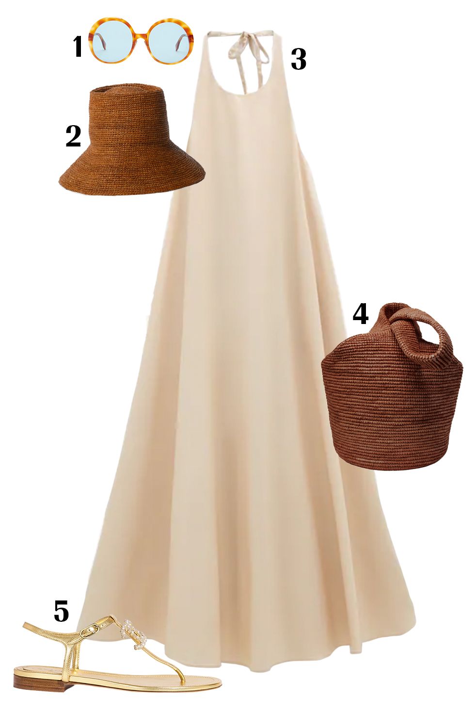 لا شئ مريح أفضل من فستان قطني طويل وخفيف بأحد الألوان الهادئة مثل الأوف وايت أو البيج ويمكنكِ إقران قبعة رأس باللون البني مع حقيبة من نفس اللون وصندل ذهبي.