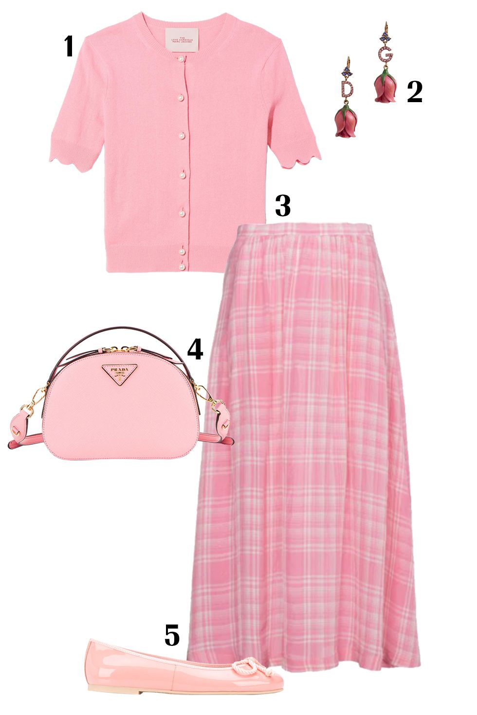 هذه الإطلالة تجمع بين البساطة والأنوثة، فشيميز باللون الوردي البسيط مع تنورة كاروهات باللونين الأبيض والزهري وأحذية بسيطة باللون الوردي مع حقيبة جلدية متوسطة الحجم بنفس اللون ستمنحكِ شعورًا بالأناقة والراحة وأقراط مستوحاة من ستايل الورود والأزهار.