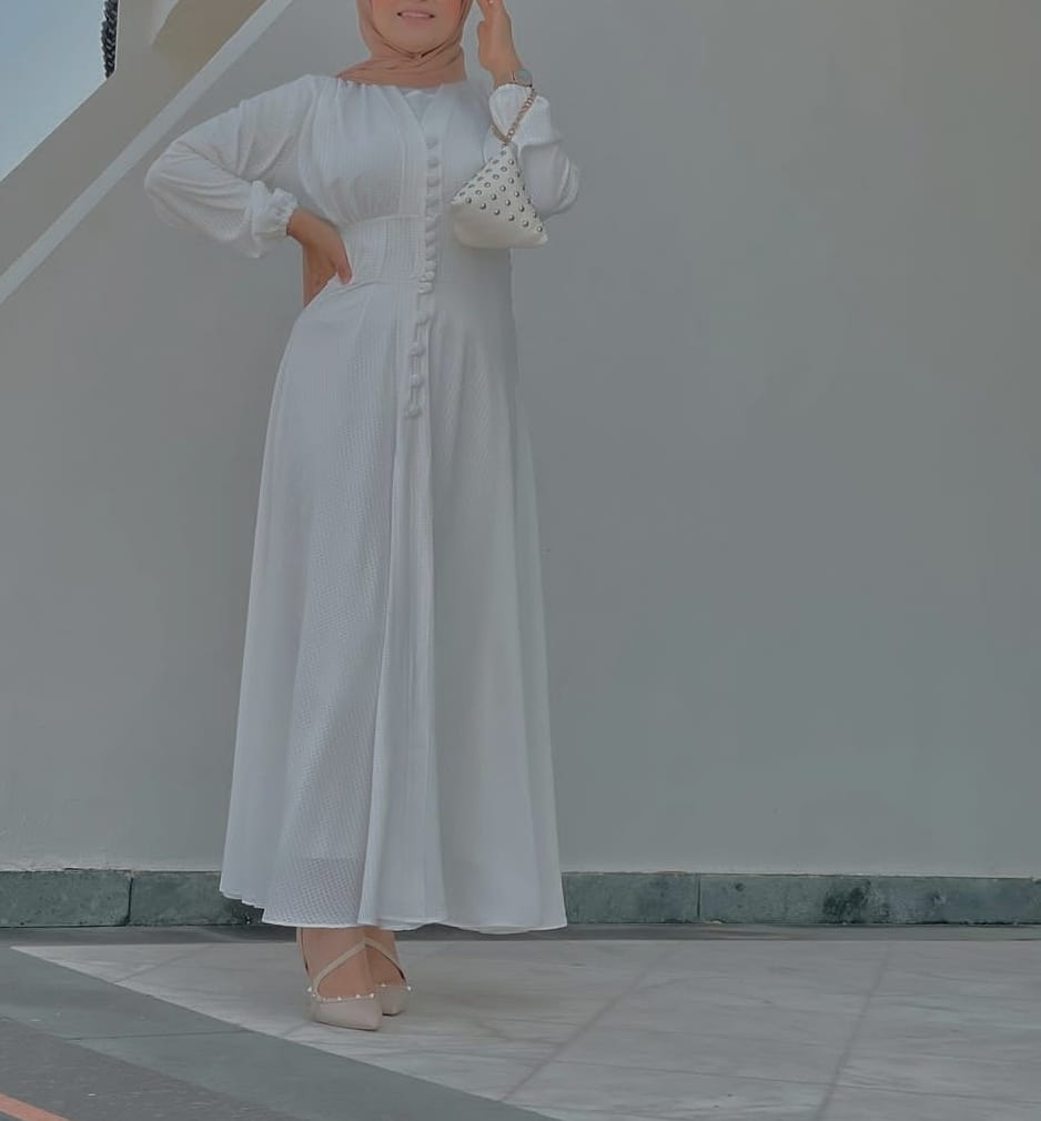 اعتمدت هنا العارضة علي فستان باللون الأبيض الملكى ونسقته بطريقة بسيطة وأنيقة فقد اختارت حجاب وحذاء باللون النيود، مع حقيبة باللون الأبيض تحمل فصوص بألوان النيود.