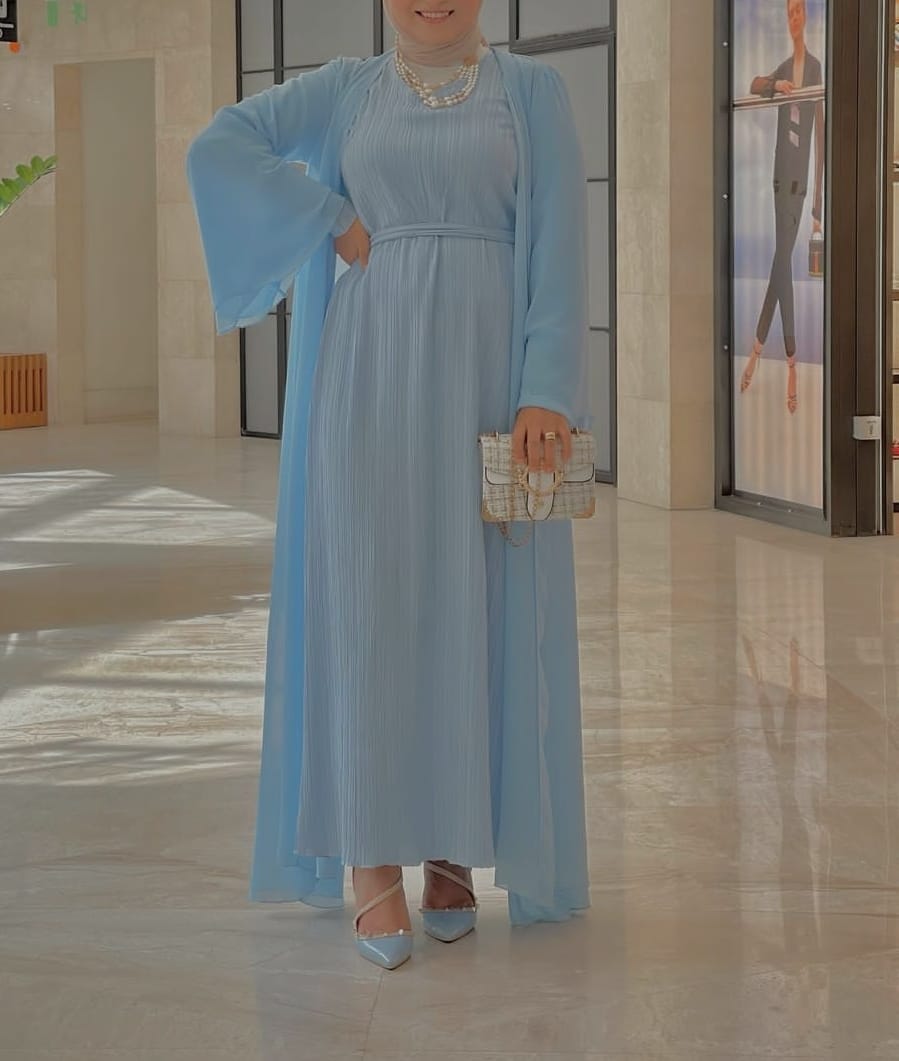 لمحبي الأناقة والفخامة والرقي، هذه الإطلالة مناسبة لكى تماماً، فقد ارتدت العارضة هنا قفطان قطعتين باللون الأزرق السماوىونسقته بطريقة أنيقة للغاية فقد اعتمدت العارضة عقد فخم من الؤلؤ، مع حجاب باللون البيج وحذاء يحمل اللون الأزرق والبيج.