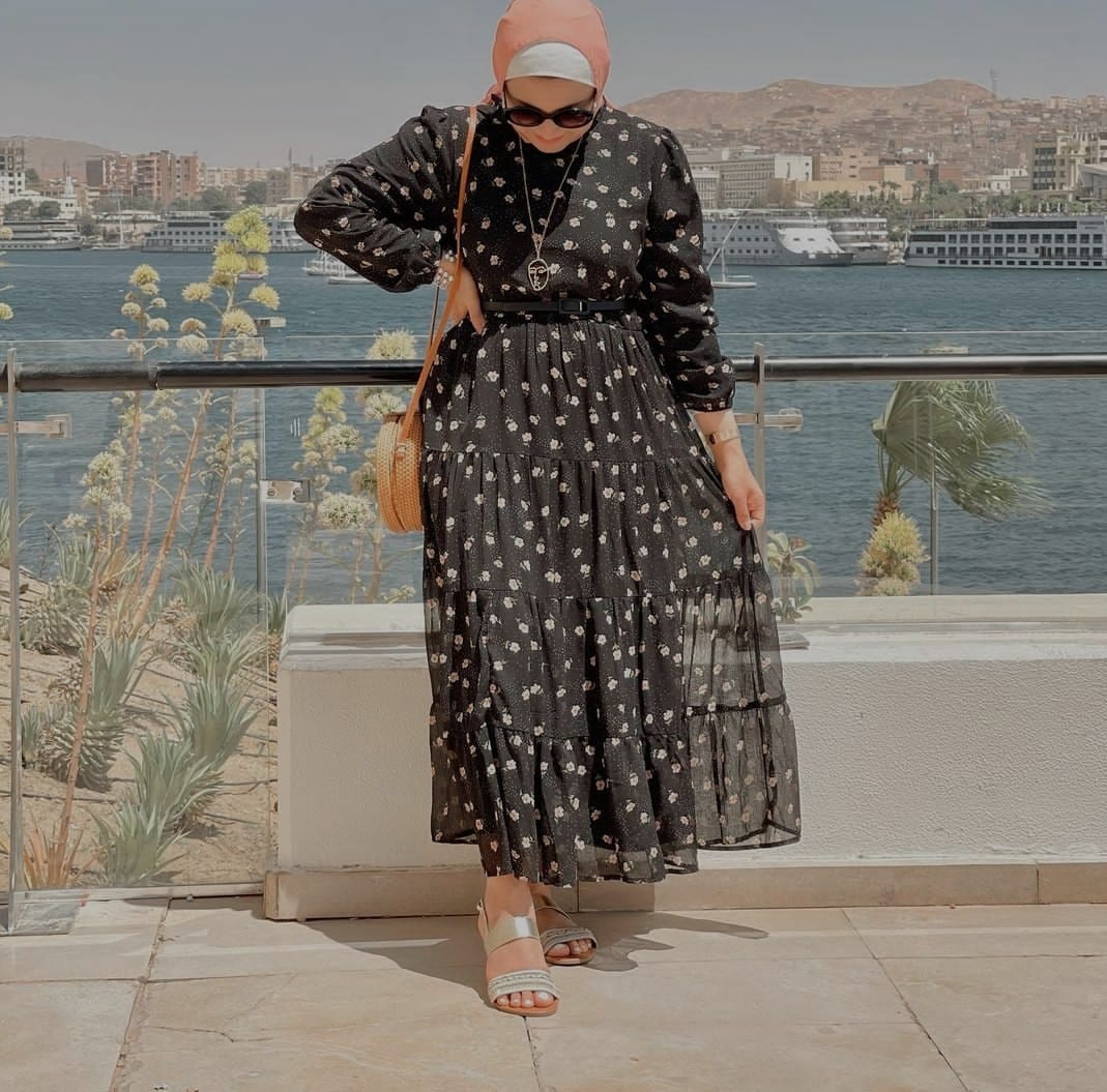 اختارت هنا الفاشينيستا فستان باللون الأسود يحمل طبعات الورد، ونسقته بطريقة عصرية للغاية فقد اعتماد حجاب رأس باللون النيود، مع حذاء مفتوح باللون الفضي وحقيبة باللون النيود.