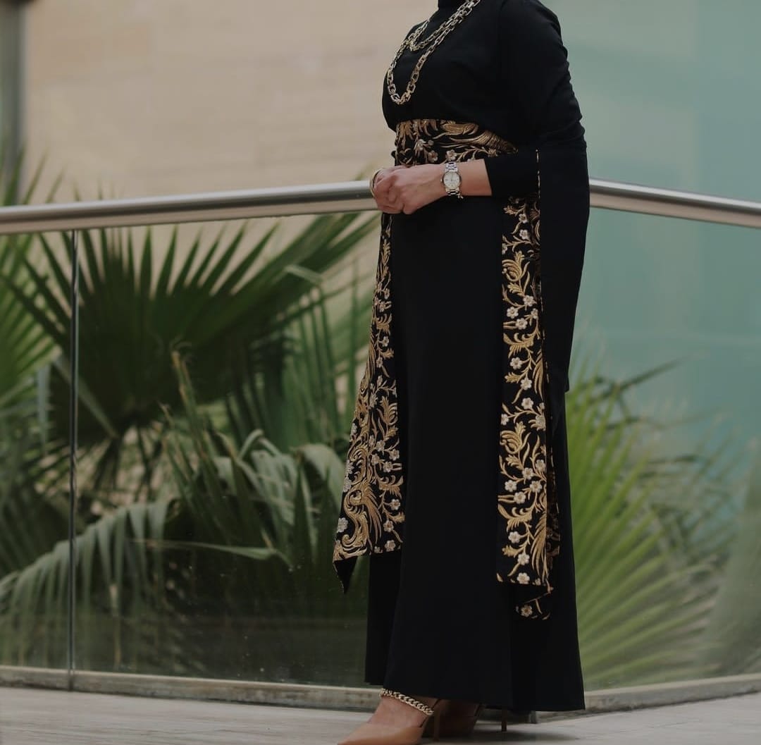 لعشاق الأسود، هذه الإطلالة مناسبة لكى، اختارت هنا العارضة قفطانب اللون الأسود مع تطريز باللون الذهبي ونسقتها بطريقة أنيقة ومحتشمة مع حجاب أسود وحذاء باللون الجملى، واعتمدت بعض الإكسسوارت الذهبية.