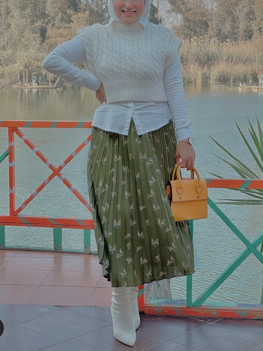 إذا كنتى تفضلين إرتداء إطلالة بخلاف القفطان والفساتين، يمكنك تجربة هذه الإطلالة المريحة بشكل كبير فقد اختارت العارضة تنورة بليسية باللون الزيتى بها نقشات وردية مع قميص وكروب توب باللون الأبيض، واعتمدت معها حجاب أبيض وحقيبة برتقالية، وبالفعل كان اختيار الحقيبة مميز للغاية.