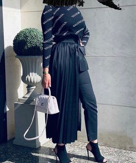 اعتمدت العارضة هنا علي توب باللون الأسود وبنطال أسود وقطعة مميزة تشبه التنورة البيليسيه لكنها مفتوحة من الأمام، وينت العارضة الإطلالة بحذاء أسود وحقيبة باللون الأبيض.