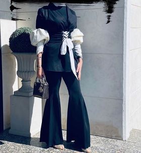 نسقت العارضة هنا جاكيت أسود بأكمام منتفخة باللون الأبيض، ونسقت معه بنطالون أسود كلاسيكى، وحذاء أسود عالى وحقيبة باللون الأسود.