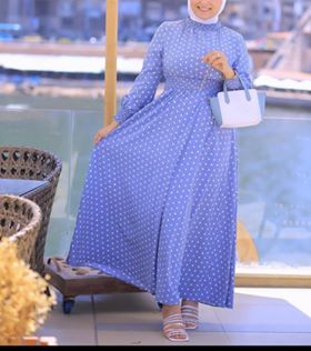 اعتمدت الفاشينيستا هنا علي فستان باللون الأزرق الفاتح المنقط بالأبيض، يعد الفستان مزيج بين الكلاسيكى والكاجول، نسقته هنا العرضة بطريقة بسيطة مميزة، فقد اختارت حذاء عالى مكشوف باللون الأبيض وحقيبة وحجاب باللون الأبيض، وبدت في غاية الأناقة.