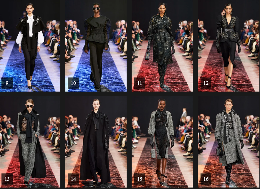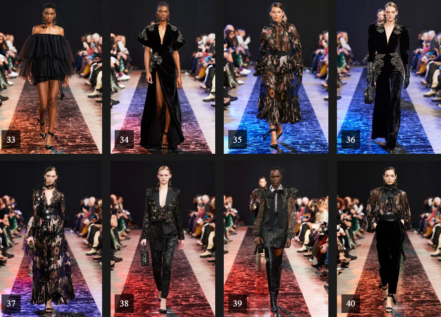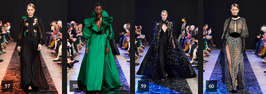 وتعد ياقة الفيونكة واللون الأسود بالإضافة إلى المخمل والاكمام المنفوشة، من السمات الأساسية لمجموعة "إيلي صعب" لخريف 2020، والتي جاءت تناسب مختلف الاذواق.