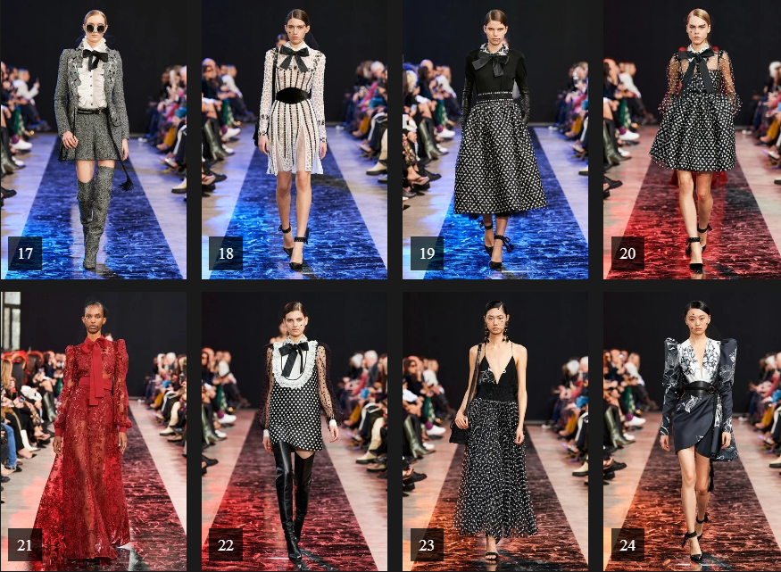 وبجانب التصاميم الكلاسيكية، تميزت المجموعة بفساتين تناسب المناسبات اليومية وغيره تميزت بلمسة "الفينتاج" وذات نقشات عديدة، وخاصة البولكا دوت، كما جاءت فساتين أخرى بأكتاف منتفخة.