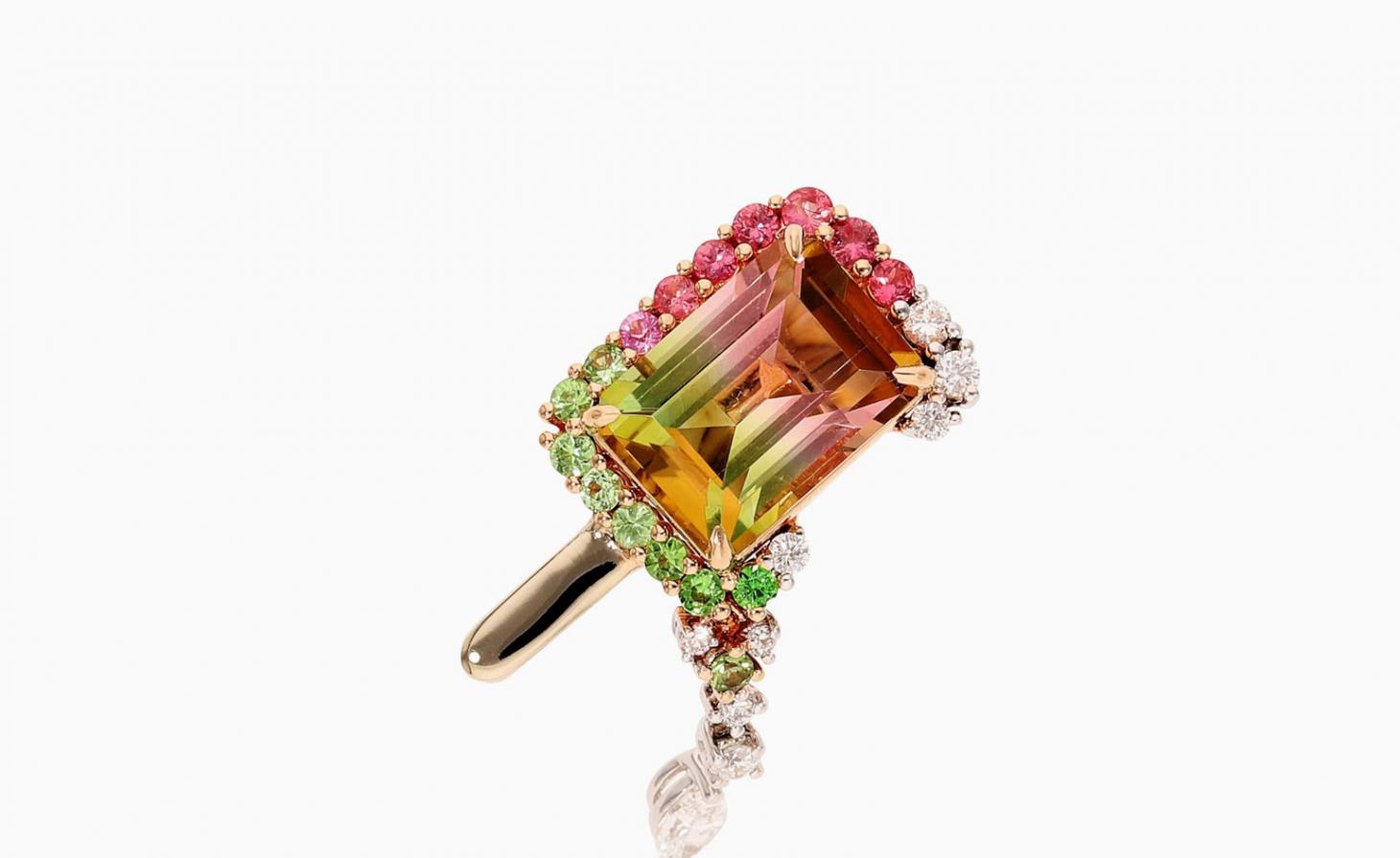 وقطعها مصممة بشكل خاص حيث يجمع بروش الآيس كريم التورمالين ثنائي اللون، والياقوت الأزرق، والماس للحصول على نظرة ثمينة في هذا الاتجاه.