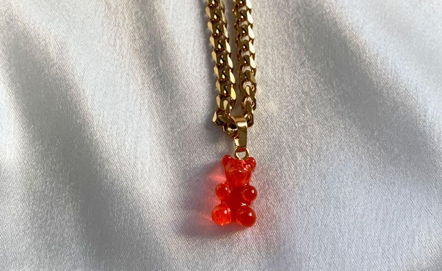 وقد قاموا بتصنيع الحلوى على شكل دب من الراتنج معلقة في صفوف ثقيلة من السلاسل المطلية بالذهب.