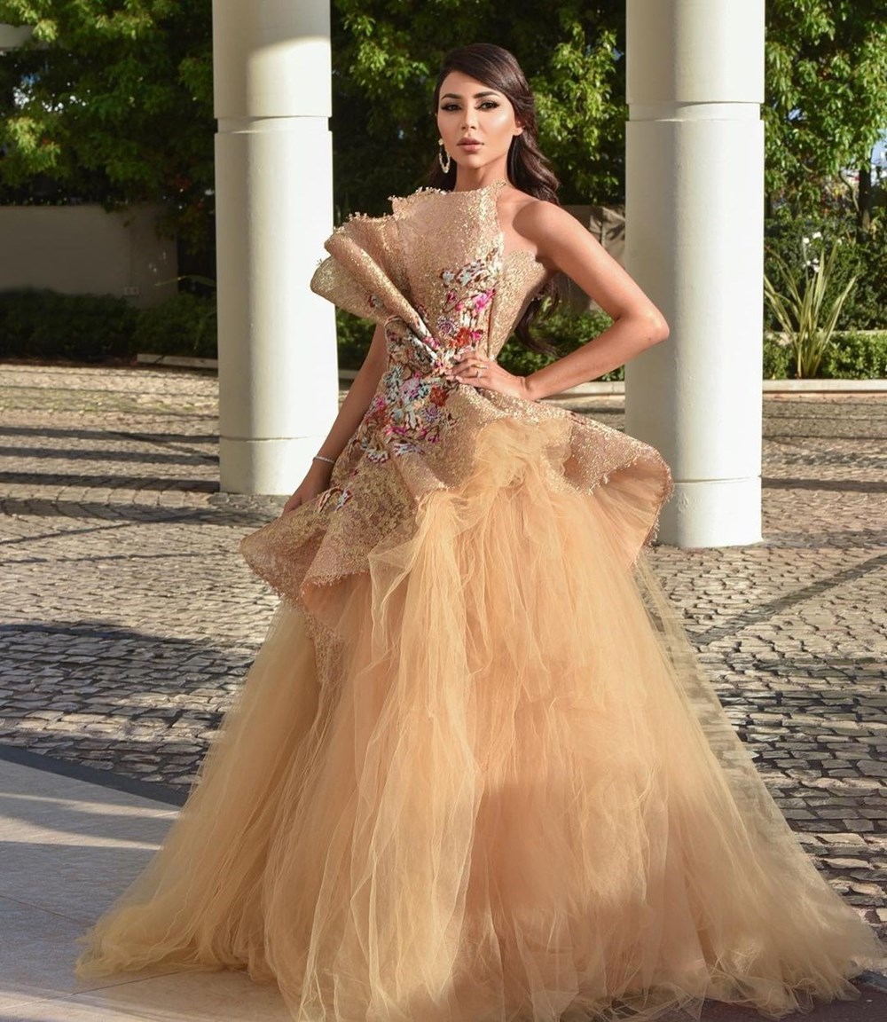 اما الإعلامية والفنانة الإماراتية مهيرة عبدالعزيز فحرصت على التألق بفستان من تصميم ميزون يحيا جاء الفستان بدون اكتاف وباللون الذهبي، وتميز بوجود تطريزات الورود على الخصر