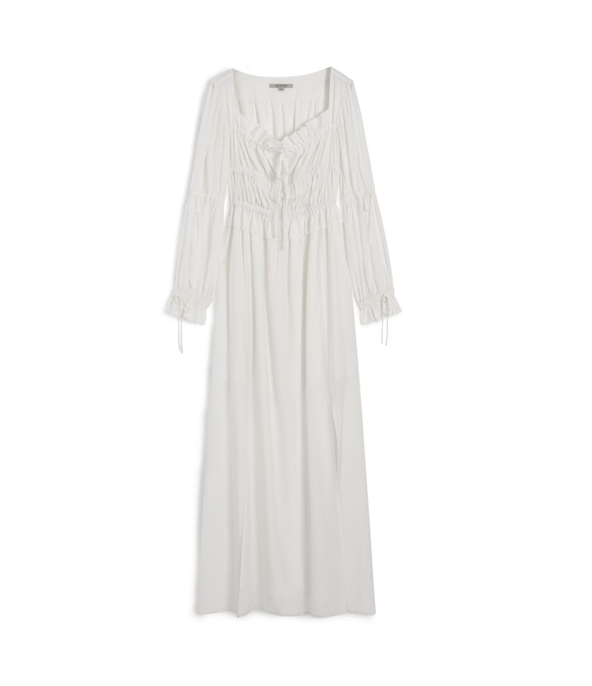 لا يجب أن يساوي الثوب الأبيض الطويل ثوب الزفاف، لذا فالكشكشة المرنة على الأكمام والجسم تجعل هذا الفستان مريح لتناول الغداء، وهو فستان طويل يلائم المحجبات.