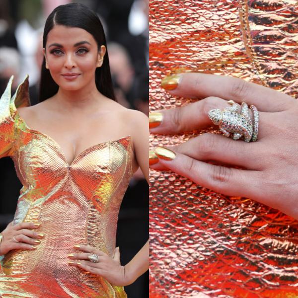 تألقت الفنانة الهندية الجميلة اشواريا راي باتشان في مهرجان كان السينمائي العام الماضي بفستان ذهبي لامع واكتفت فقط بارتداء خاتم الثعبان على اصبعها ولم ترتدي أي قطعة مجوهرات أو اكسسوارات اخرى وبدت جميلة وأنيقة بمظهر أنثوي جرئ.