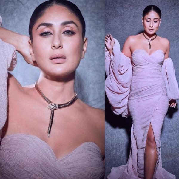 تألقت النجمة الهندية كارينا كابور بفستان وردي جرئ وأكملت الإطلالة بقلادة على شكل ثعبان حول رقبتها مما أضاف الجرأة على إطلالتها.
