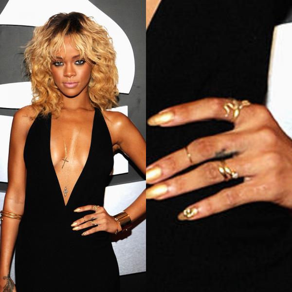 ظهرت المغنية الباربادوسية ريهانا في إحدى حفلات توزيع جوائز مهرجان غرامي بإطلالة جريئة حيث ارتدت فستان أسود مكشوف وعدة اكسسوارات ذهبية منهم خاتم ذهبي صغير على شكل ثعبان.