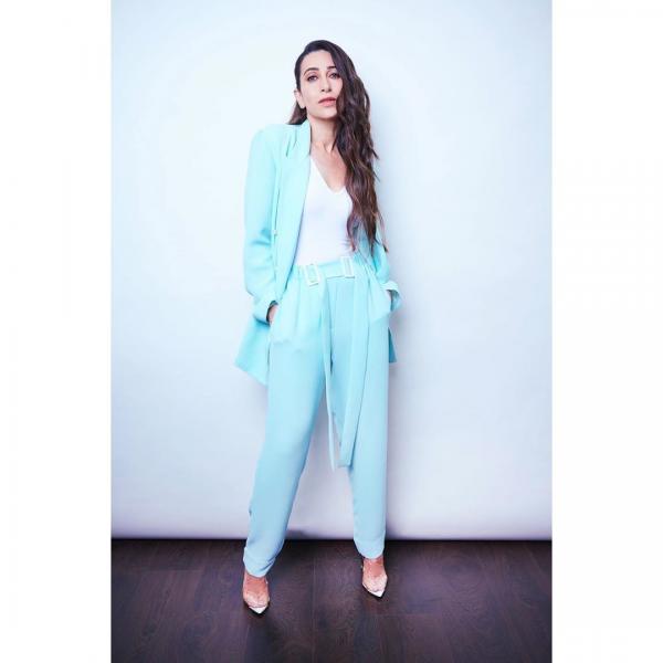 ظهرت كارشما ببدلة رسمية باللون الأزرق الجليدى ونسقت معه توب باللون الأبيض وحذاء شفاف.