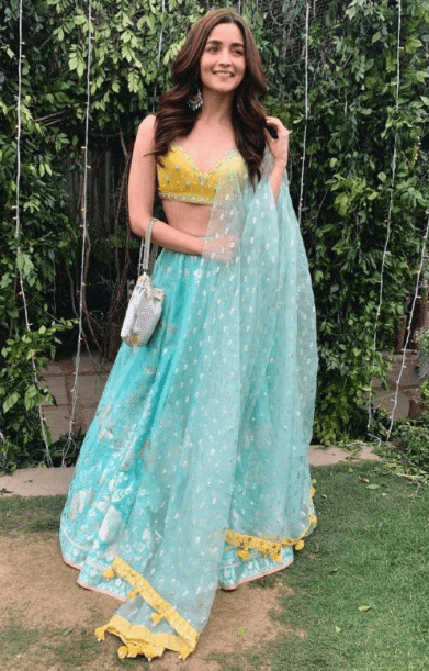 ظهرت الجميلة عليا بهات في سارى باللون الأزرق الكلاسيكى الأنيق، ارتدته مع بلوزة صفراء لامعة، زينت الإطلالة بحقيبة فضية وشعر مموج ومكياج ناعم.