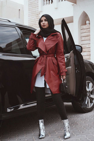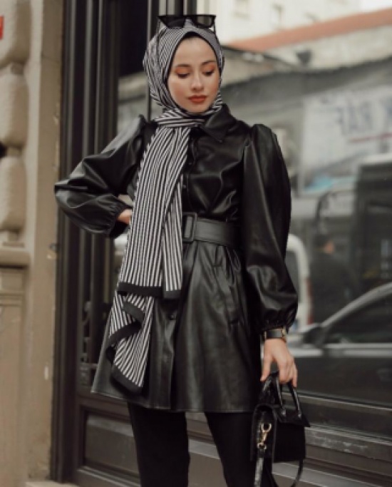 اعتمدت هنا العارضة علي بلوزة من الجلد باللون الأسود، وتعد هذه القطعة من القطع الرائجة هذا الموسم وبشكل خاص بين المحجبات، وقد نسقتها هنا العرضة بشكل انيق مع بنطال لأسود وحذاء أسود وحجاب باللونين الأسود والأبيض.