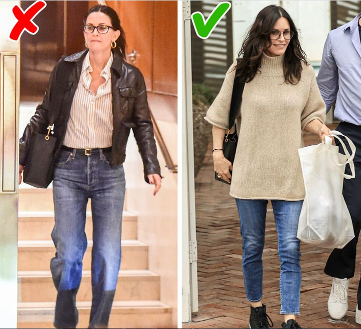 قومي بالتخلص فورًا من جميع أنواع السراويل التي تبدو مترهلة وكبيرة عليكِ، بدلا من ذلك، ارتدي بنطلون جينز ضيق، فهو يجعلك تبدين أنيقة دائمًا، ويمكن إقرانه بسهولة مع بلوزات بطرز مختلفة لإبراز قوامك ويجعلك تبدين أنحف وأصغر سنا.