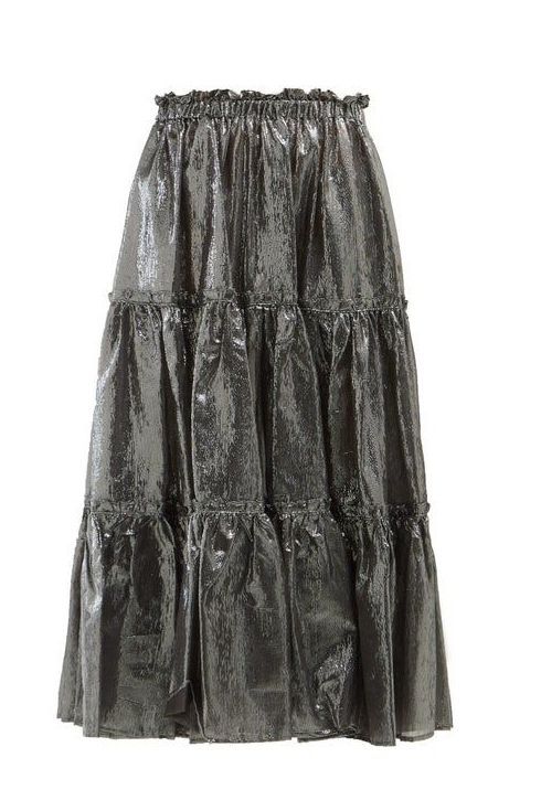 تعتبر هذه التنورة المتدرجة المصنوعة من اللاميه اللامع والأنيق من أكثر الموضات التي برزت في سبعينات القرن الماضي وهي مناسبة للخروج صباحًا ومساءًا ويمكنك تنسيقها مع عدة الوان كالأبيض والأحمر والأزرق والأصفر.