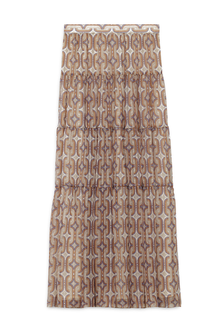 تتميز تلك التنورة المصنوعة من الحرير بنقشاتها المميزة التي تشبه السلاسل السميكة ولا تحتاج هذه الإطلالة إلى المغالاه في إرتداء الإكسسوارات الكثيرة لذلك يمكنك إرتداؤها مع زوج من الأحذية الرياضية البيضاء كخيار مناسب للصباح أو إرتداء البوت الأبيض المرتفع للركبة كخيار مناسب لخروجات المساء.